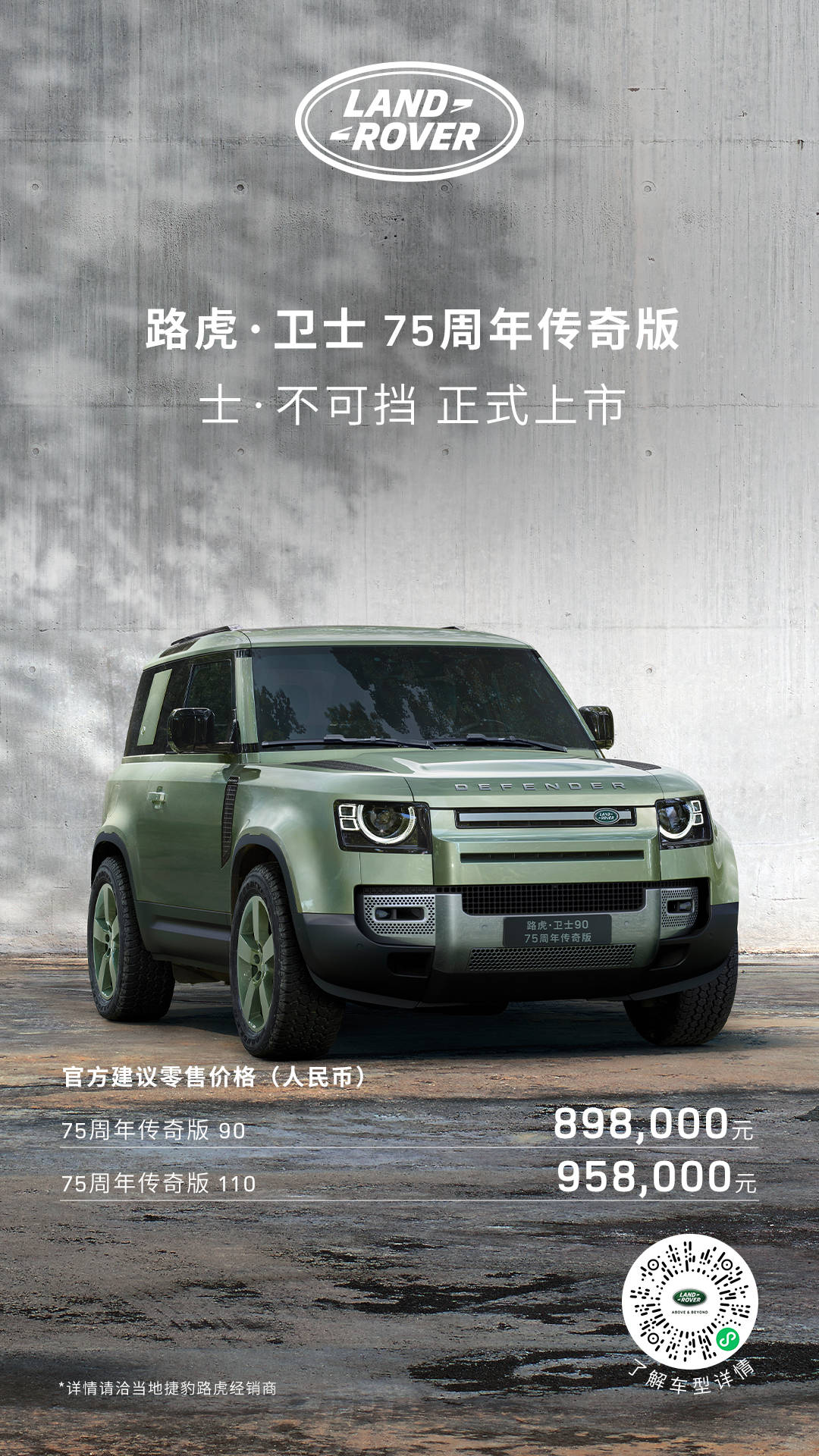 12月26日晚间,路虎汽车官方宣布,路虎卫士75周年限量版正式登陆中国市场。共推出两款车型,官方售价89.8-95.8万元。卫士是路虎品牌旗下历史最悠久,车系最古老的车型。为庆祝路虎成立75周年,新车是基于HSE版本车型打造而来的,外观细节上有所调整,并且采用了新的标记,将增强的性能与精致的奢华相结合。与此同时,发布会上还亮相了全新路虎卫士130车型并同时开启预售。路虎卫士130车型在此前的VIP贵宾服务基础上进行了一系列升级,推出专属“典范无忧服务”。车主可享3年内6次免费保养,同时还将享受事故车免费道路救援以及优先接待等贵宾礼遇服务。