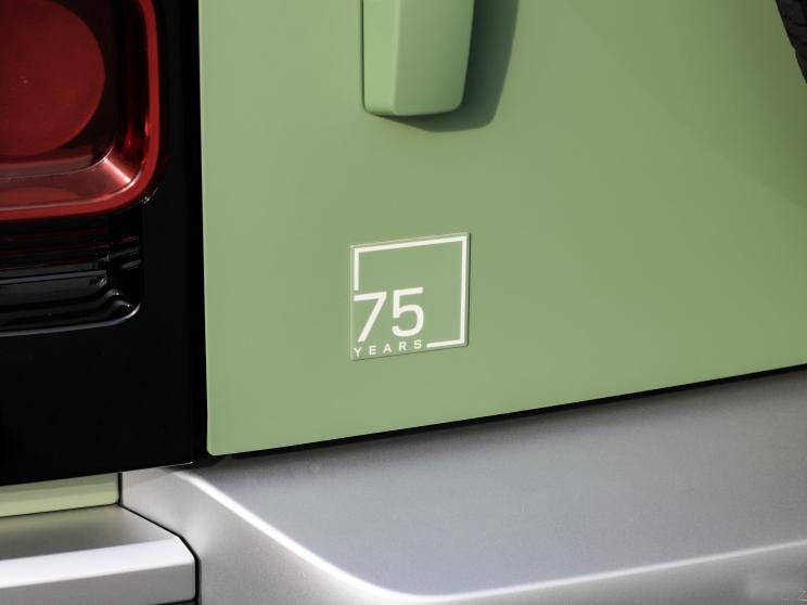 车身侧面,新车采用了双门设计,身形方正,姿态硬朗,并搭载了20英寸轮圈也采用了车身同样的格拉斯米尔绿色,设计感较强。新车的尾部配备了四组圆矩形的垂直布局的尾灯组,并提供外挂式备胎设计,此外,纪念版在后备厢门左下角带有"75thLimitedEdition"的纪念铭牌,更好的展现了新车特殊的身份。