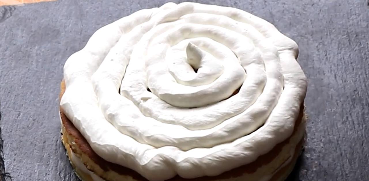 13、再放一层蛋糕,再挤一层奶油。