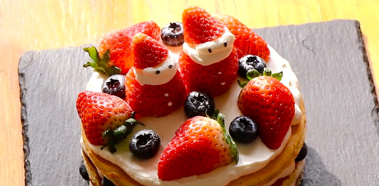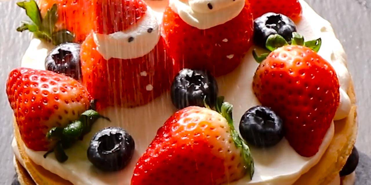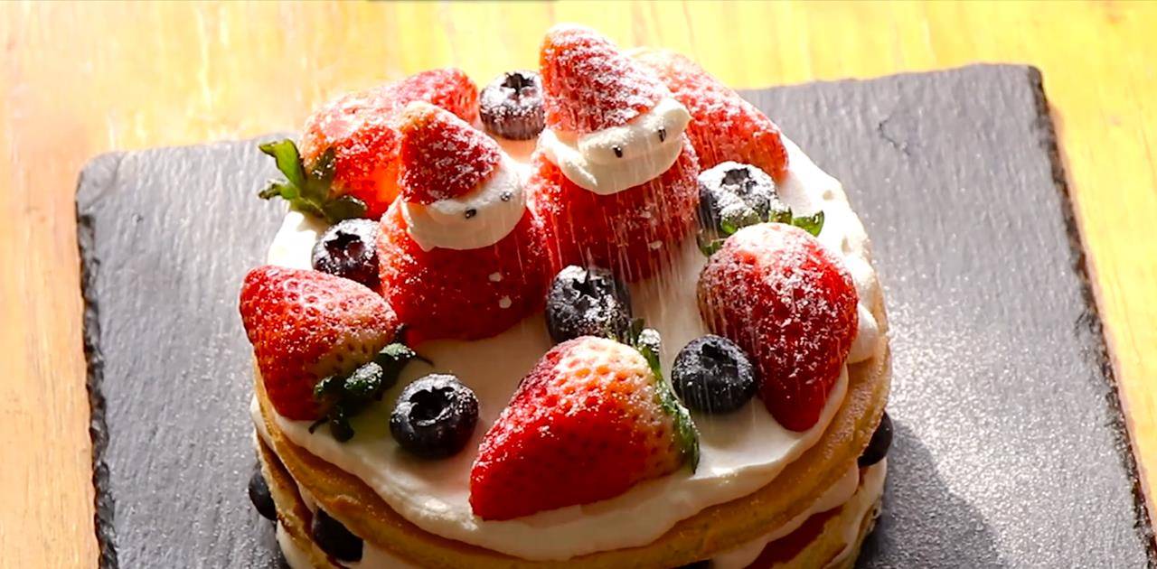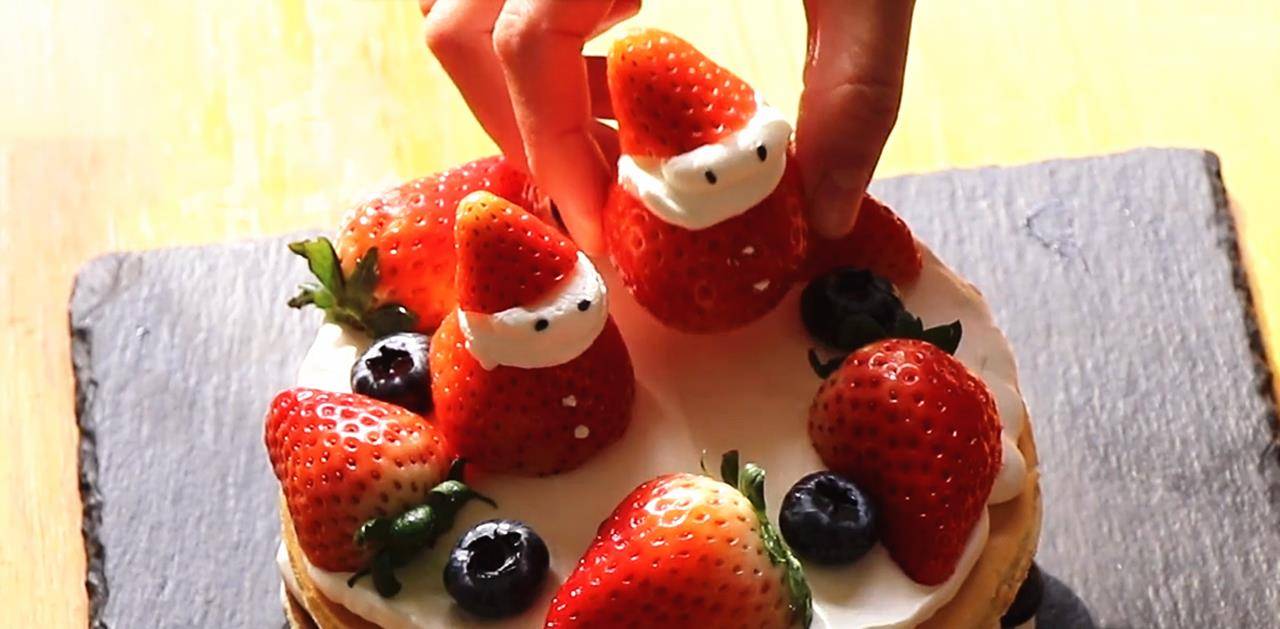 16、在上面铺上草莓或者其他水果,上面放上刚才做好的圣诞老人,表面撒上一些糖粉,一个蛋糕就做好了。