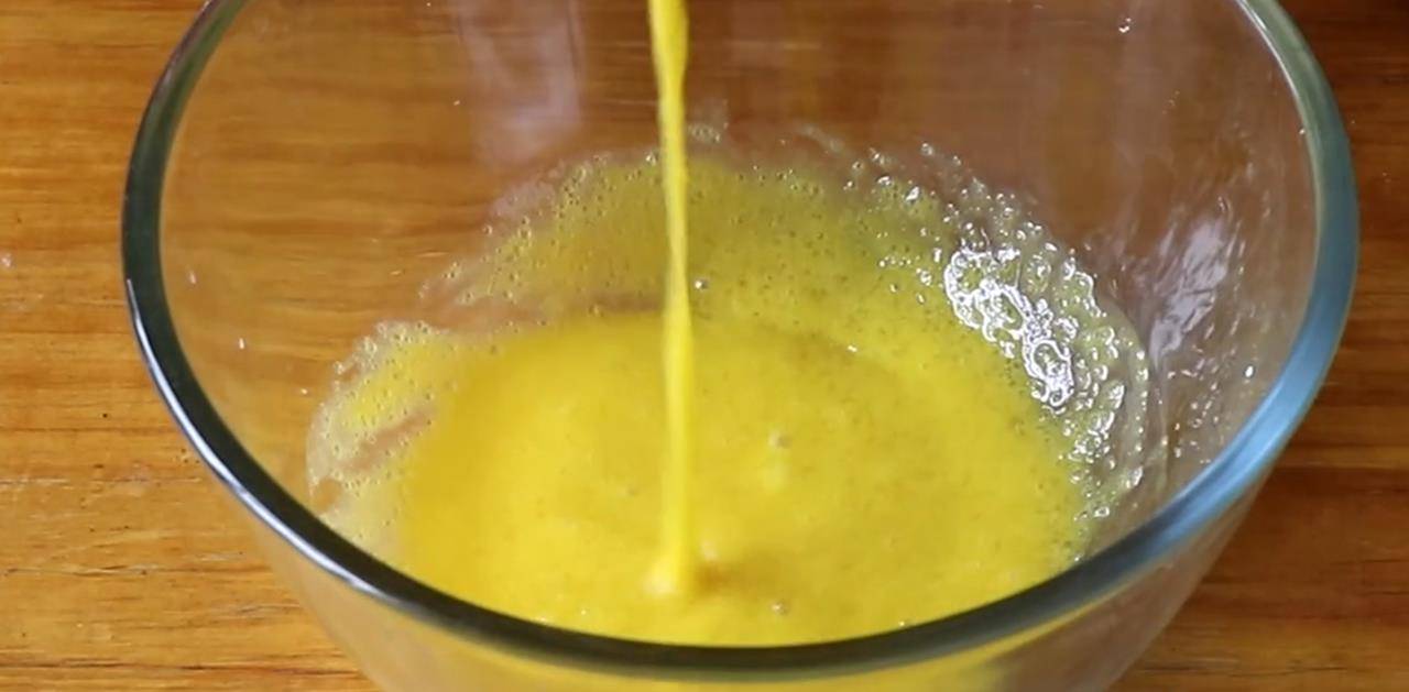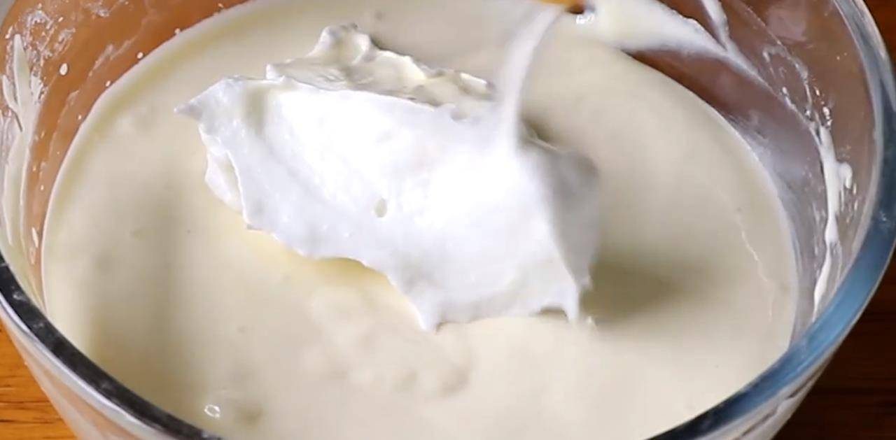 7、将三分之一的蛋白霜舀入蛋黄糊中,拌匀,再舀第二次,再次拌匀,最后加入所有的蛋白霜,拌匀。
