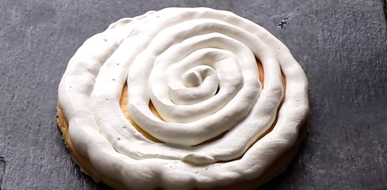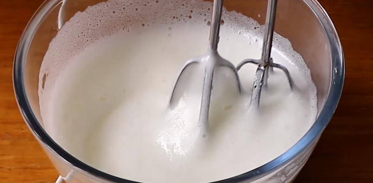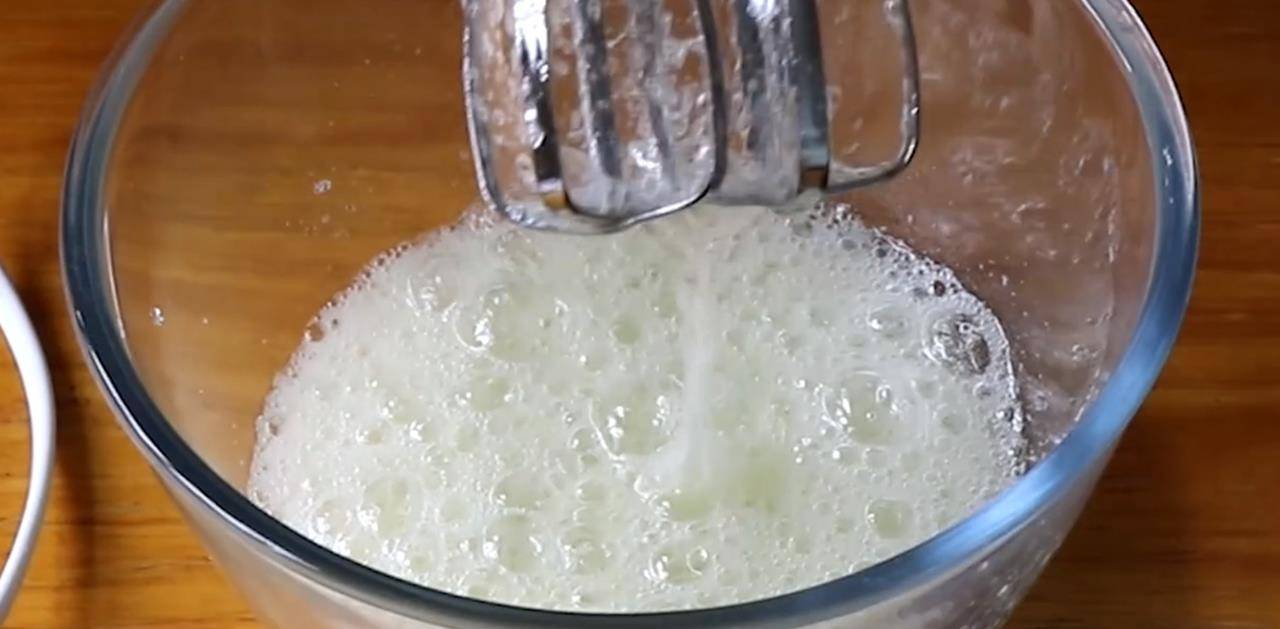 4.现在做蛋白酥皮。先在蛋清中加入10克糖,用打蛋器高速打至蛋白霜出现粗大气泡。