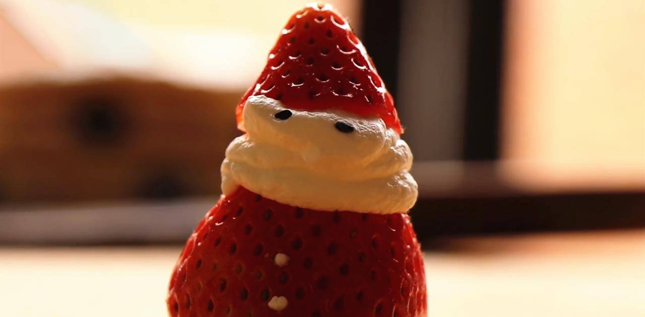 15.要做圣诞老人,去掉草莓尾巴的“屁股”部分,剪掉小尖头部分。然后挤奶油,把小尖朝上,最后用黑芝麻装饰眼睛,用奶油点出肚子上的纽扣,一个圣诞老人形象就做好了。