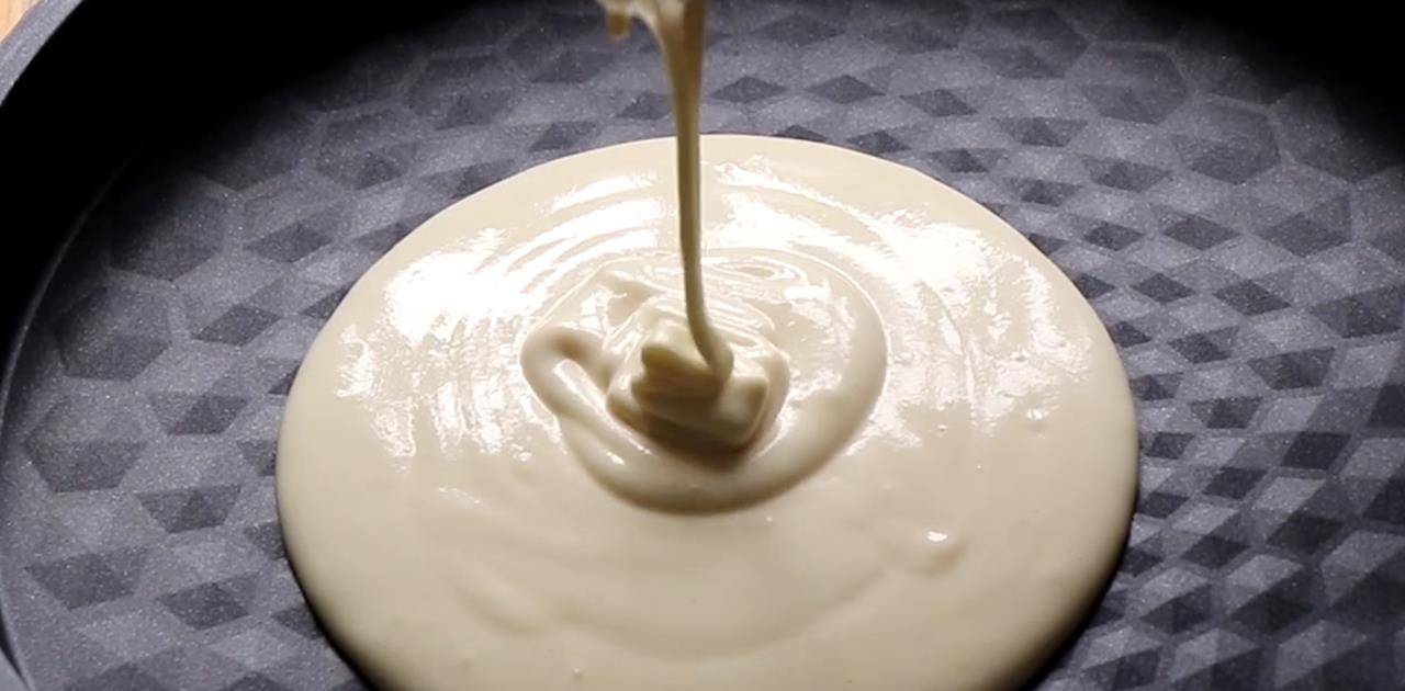 舀一勺面糊,一直倒在中间的位置,让面糊呈圆形出来,盖上盖子,用小火慢炖。