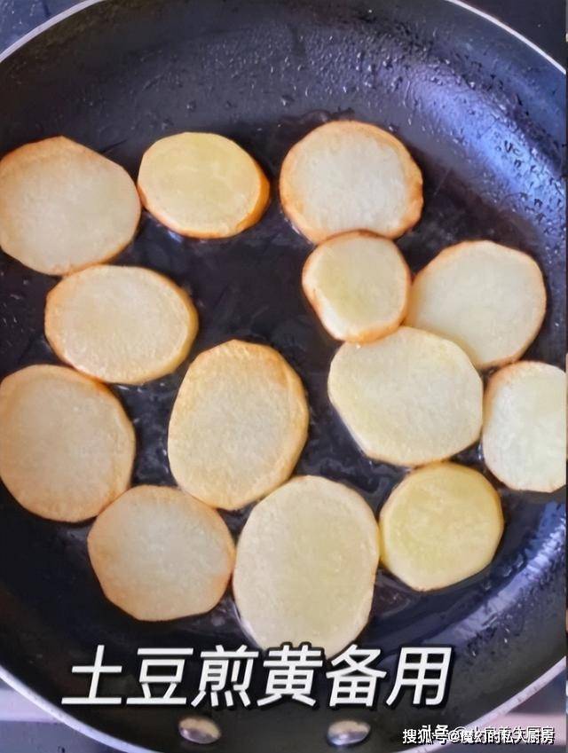 第四步:锅底调入少许油,土豆片铺在锅底,小火慢慢煎一会儿,煎至微微焦黄,盛出备用。