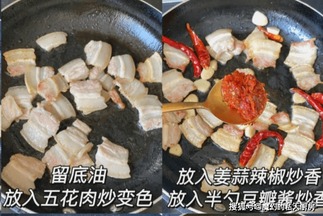 第五步:锅底继续加上油,倒入腌制好的五花肉,煎出五花肉的肥油,迅速煸炒一会儿,放入葱姜蒜,调入豆瓣酱炒出香味。